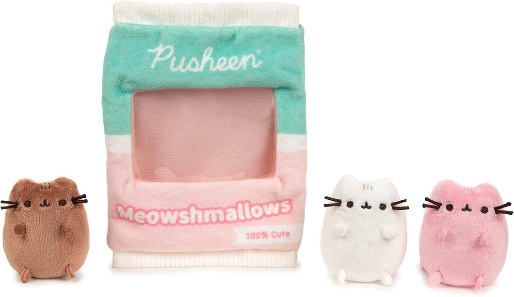 PUSHEEN MEOWSHMALLOW PLUSH: This cute 7.5” plush bag features a soft pastel pink and green exterior with a clear vinyl viewing window, perfect for collectors and home décor. The plush bag is resealable and contains three miniature removable 3” Pusheen plush in pink, white, and brown.